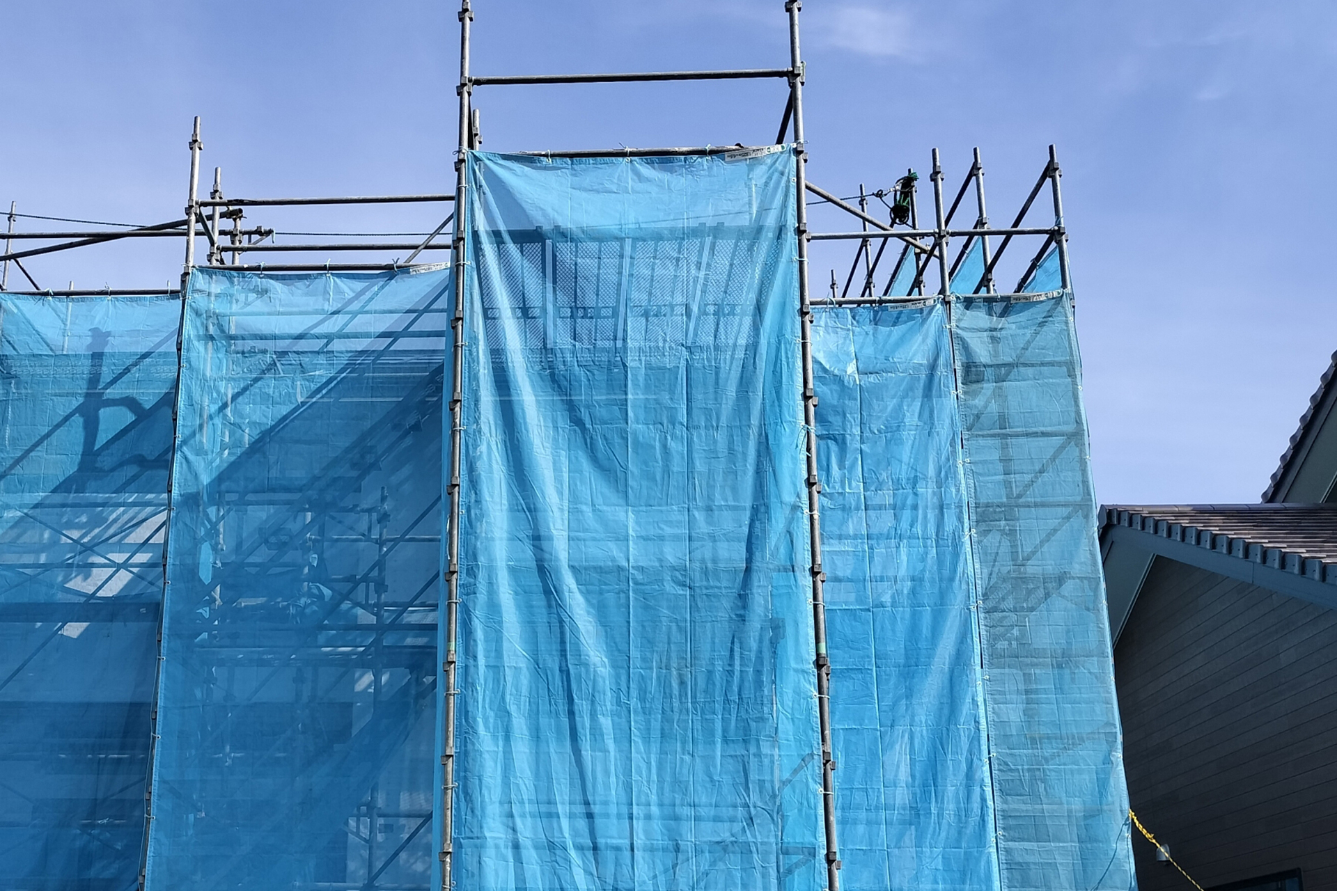 塗装作業時に発生する塗料の飛散や、高圧洗浄時の水しぶき、ケレン作業時の粉じんなどが近隣に迷惑をかけないようネットを架けます。
